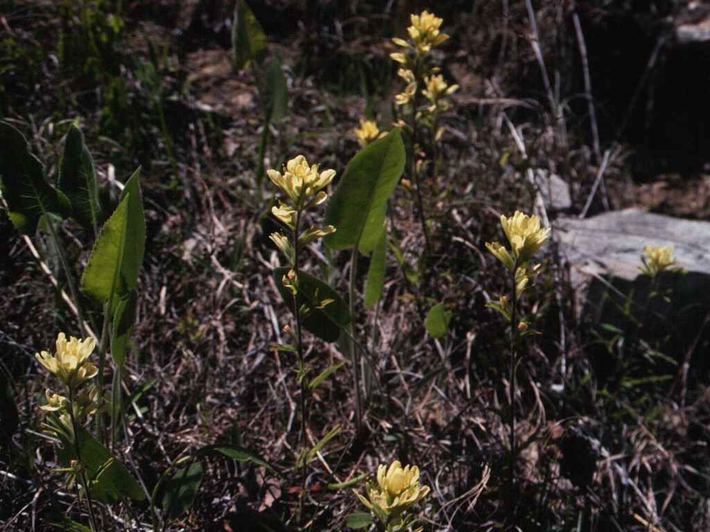 The divergence between Castilleja kraliana and C. coccinea is apparently related to a difference in pollinators, with red-flowered C. coccinea pollinated by hummingbirds, while C. kraliana, as is usual with yellow-flowered Castilleja, is pollinated by bees (Chuang and Heckard 1991, Duffield 1972). Indeed, we saw and photographed a (putative) Bombus sp. "working" the flowers of C. kraliana. Presumably, C. kraliana is derived from C. coccinea, with the divergence due to a shift in pollinators, though the reverse could instead be true. According to label data seen in several herbaria, additional entirely yellow-flowered populations, referred to C. coccinea, are known. It would be a useful project, never more feasible than it is today, to ascertain whether these populations are all genetically more closely related to each other, or whether a shift in pollinators has occurred repeatedly in that species and some yellow-flowered populations are more closely related to red-flowered populations of the same region than to other, more distant, yellow-flowered ones.